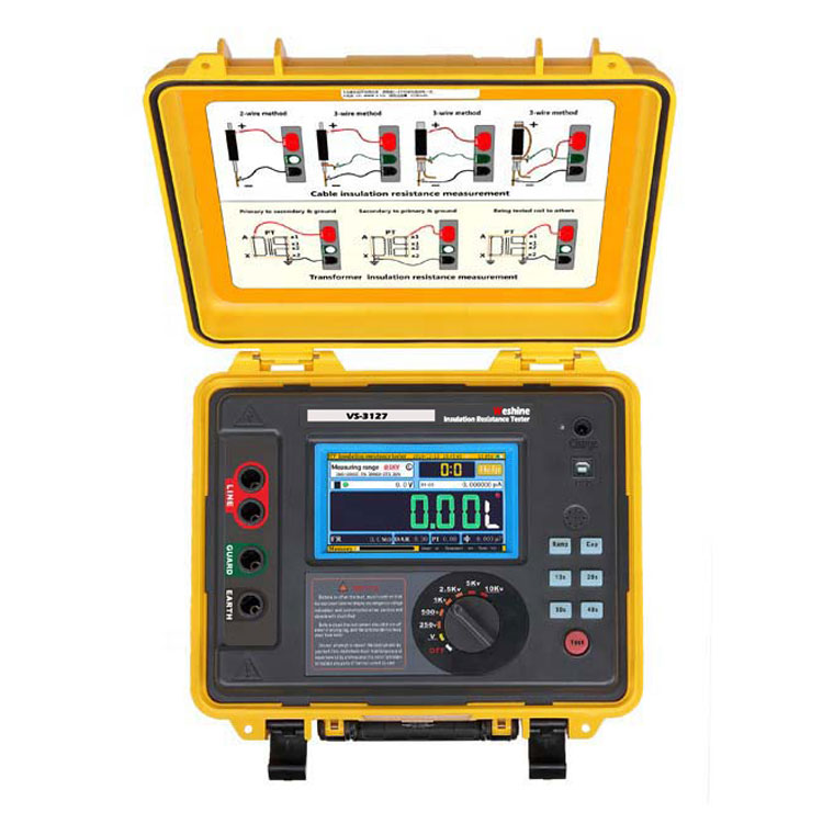 Weshine® VS-3127 is a battery powered Megohm Meter Test with digital and analogue arc display, designed for high voltage insulation resistance testing in the maintenance and servicing of cables, rotating plant machinery, transformers, switchgear and industrial applications.